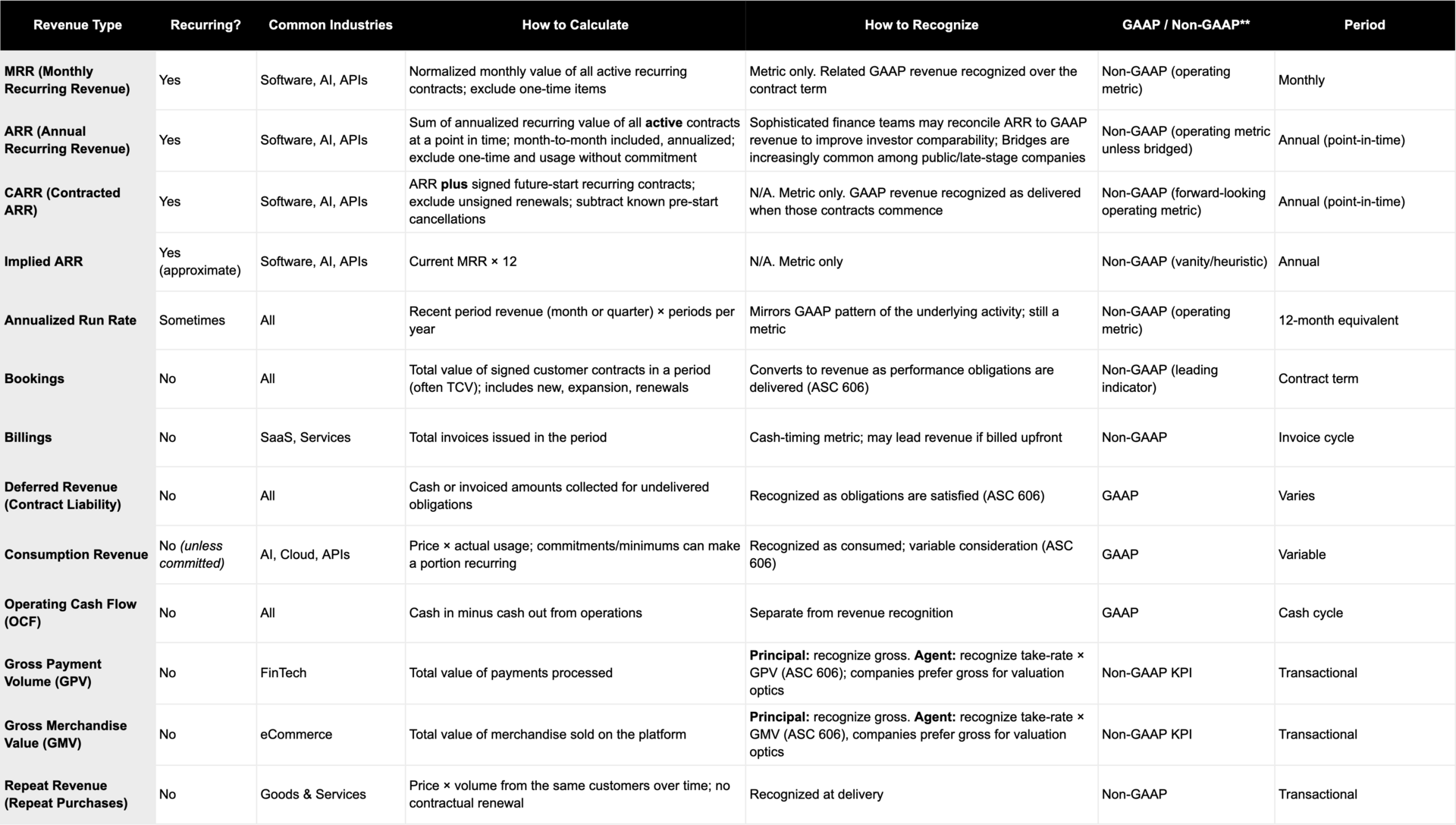 **Note on GAAP Revenue: GAAP revenue shows up on your income statement, and it is the standard set by FASB, relied upon by the IRS and SEC for taxation and regulation. It helps to create a standard way of measuring economic value delivered over time across businesses and industries. GAAP comes from one simple rule: businesses can only count money as revenue when they have delivered what they promised to customers. As you can see, the metrics above have little to do with GAAP revenue and more to do with operational performance and enterprise value.