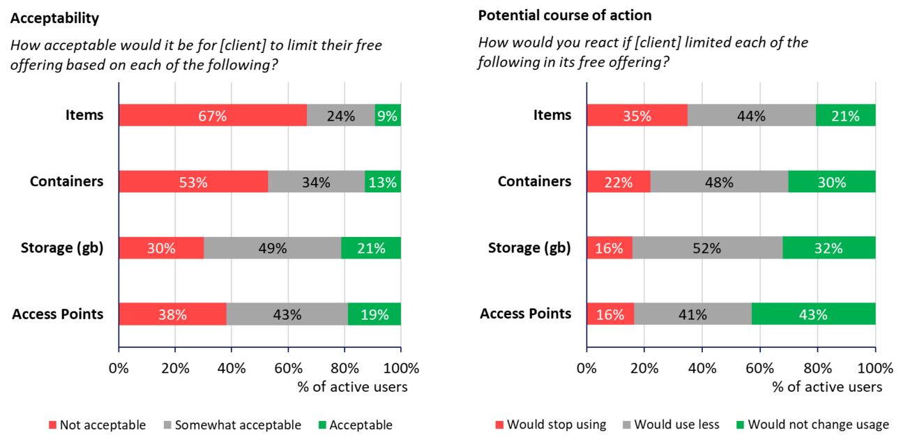 In the graphs above, access points looks like a safe bet, but storage is a close second. FWIW, I care far more about the left graph (perceived acceptability) than the right graph (churn response). The left graph speaks to fairness (aka Communicability), while the right one is a messy proxy for willingness-to-pay. In this project for example, we found that customers had the highest willingness-to-pay for Items, despite them generally thinking that charging for items would be unfair.