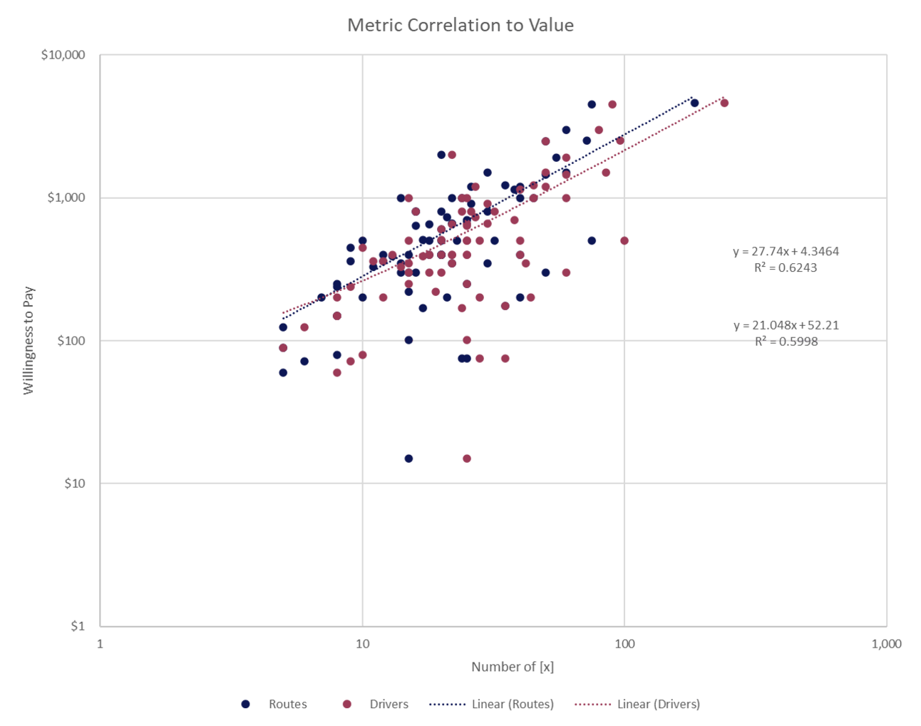 The takeaway from the graph above is not exciting. When you compare the predictive value of drivers and routes, they predict willingness-to-pay equally well (R-squared of .59 compared to .62 respectively). Maaaaaybe routes is a little better, but is it worth doing a metric change? Probably not.
