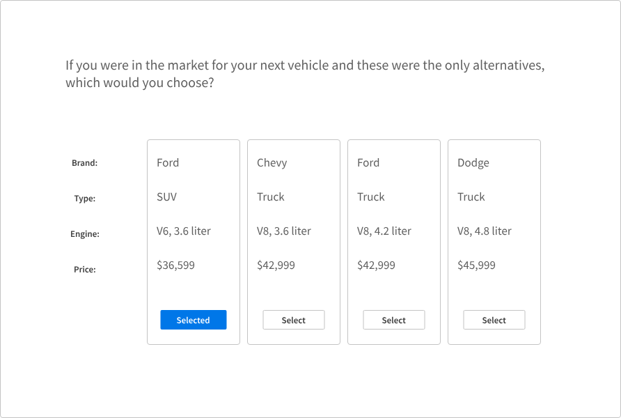 The absolute gold standard for price metric discovery would be to run survey respondents through a conjoint study. There is WAY too much to cover in this post about what that entails, but here’s an example, taken from the OG conjoint software, Sawtooth. You show respondents a screen like this and ask them to pick their favorite option:
