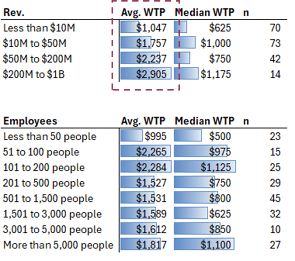 In the example below, we first measured each customer’s willingness-to-pay, then segmented those same customers according to revenue and employee count. The three main takeaways are:
