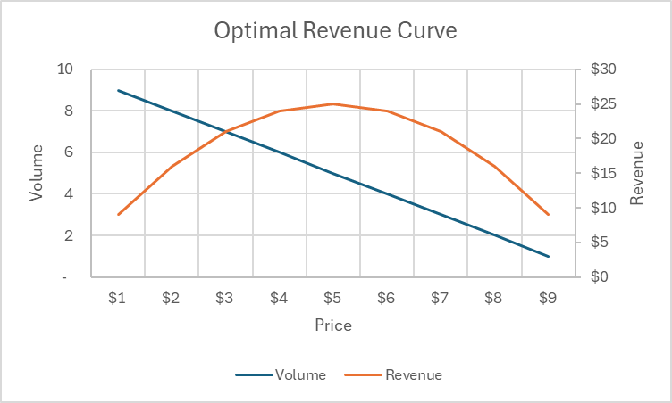 The curve below shows you how much revenue you would make at different price points. Obviously, the optimal point is at $5.