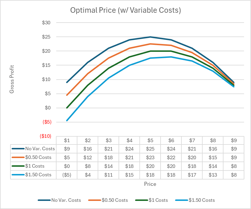 Let’s look at the math. Below is a graph that shows how the optimal price curve shifts down and to the right as our variable costs go up. But even at 30% costs ($1.50), our optimal price barely changes from $5 to $6. Furthermore, the total profit at risk of getting it wrong by $1 reduces from 4% (@ no variable costs) to 2.8% (@ $1.50 variable costs).